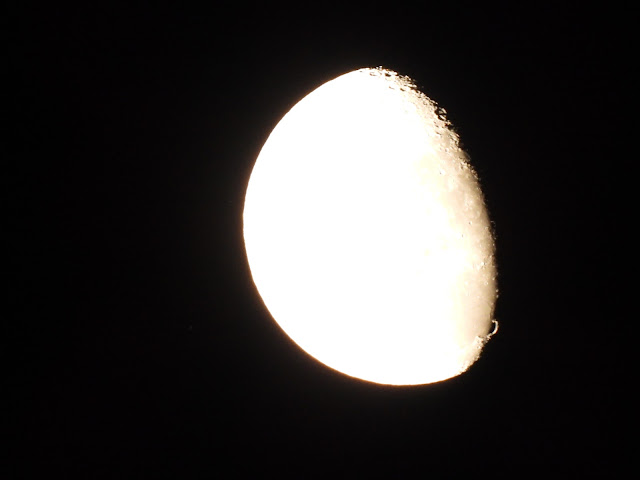 This picture was taken a few minutes after the first one. I think you'll agree that the right hand moon is closer to being even with the left hand moon in this shot than it is in the previous photo. We are seeing them move past each other. I wish I had taken more shots and could continue the progression for you.